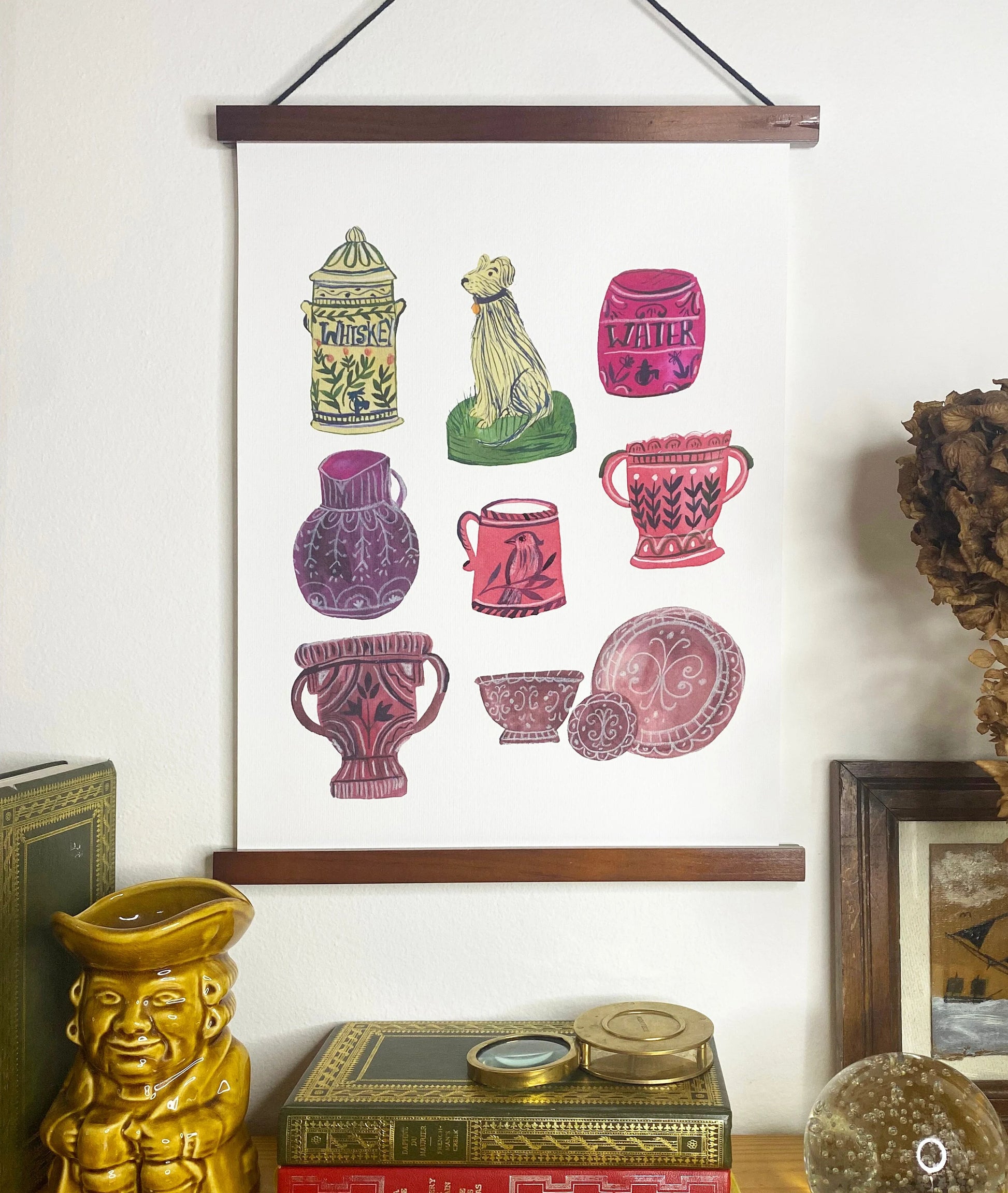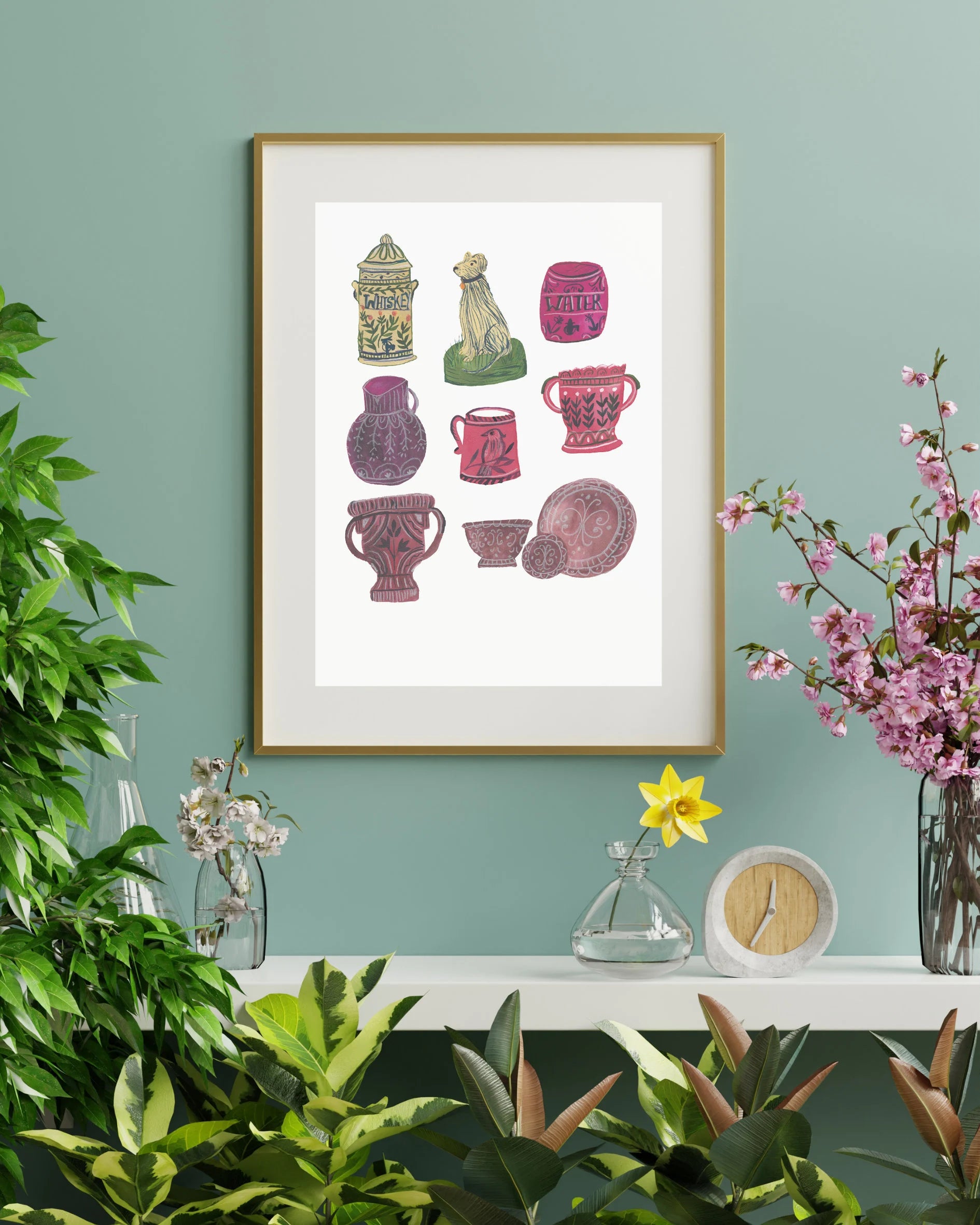 Add a touch of vintage charm to your home with this beautiful A3 illustration print featuring rustic antique pottery. The original artwork was painted in gouache and has been lovingly reproduced on high-quality prima cotton paper.