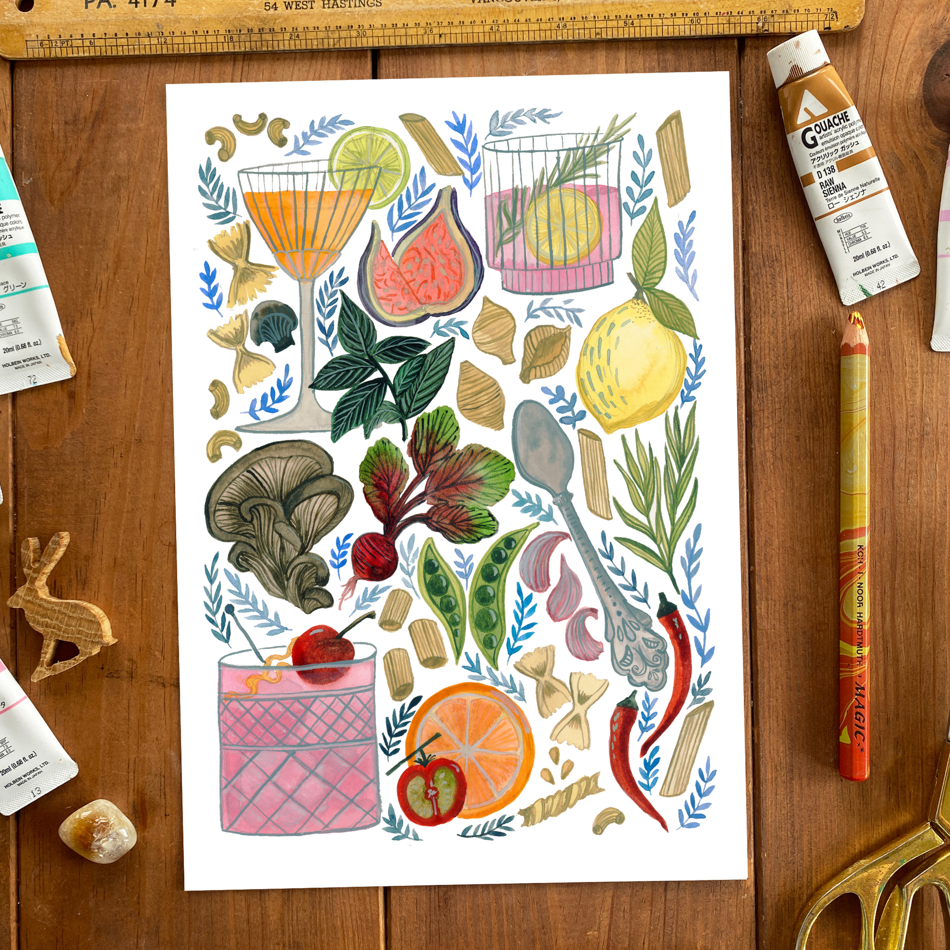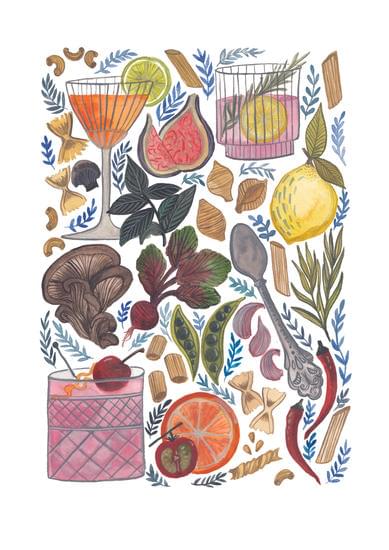 This cosy, cocktail-hour kitchen print was created for my older sister, a devoted foodie and passionate home cook. Inspired by my favourite Italian restaurant in Vancouver Pronto it now hangs proudly in her beautiful kitchen.
