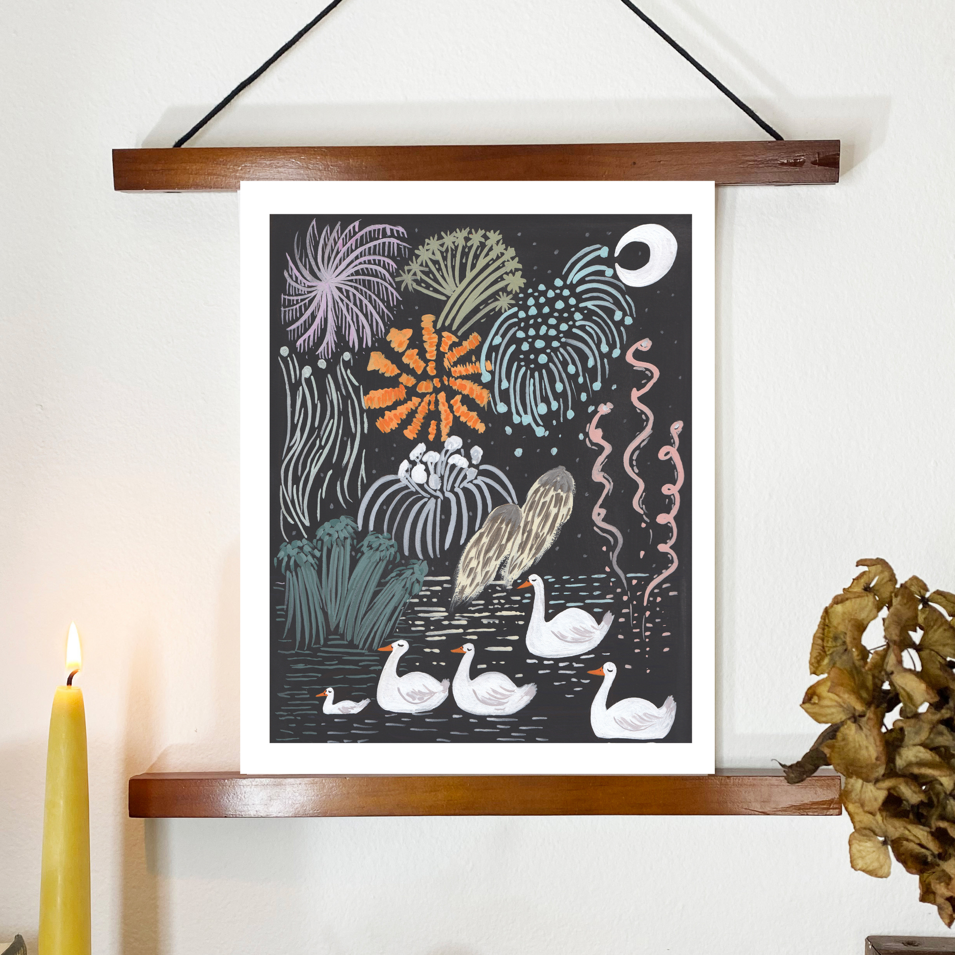 This stunning A4 print features two elegant swans gracefully gliding through the moonlit waters, surrounded by a colorful burst of fireworks against a starry night sky. Inspired by Tchaikovsky's timeless masterpiece, Swan Lake, this print captures the beauty and majesty of these beloved birds in a breathtaking display of light and color.